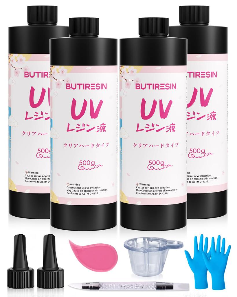 【BUTIRESIN UV Resin Kit】Large capacity 500g x 4 bottles of UV resin. High-quality type with high transparency, fast curing, and yellowing resistance, ideal for accessory making and DIY. The nozzle cap allows for precise control of the liquid volume. The gloves provide excellent hand protection, and the opener allows for easy opening. A silicone pen and mixing cup are included for smooth operation. Detailed instructions are also provided, making it easy for beginners to use.