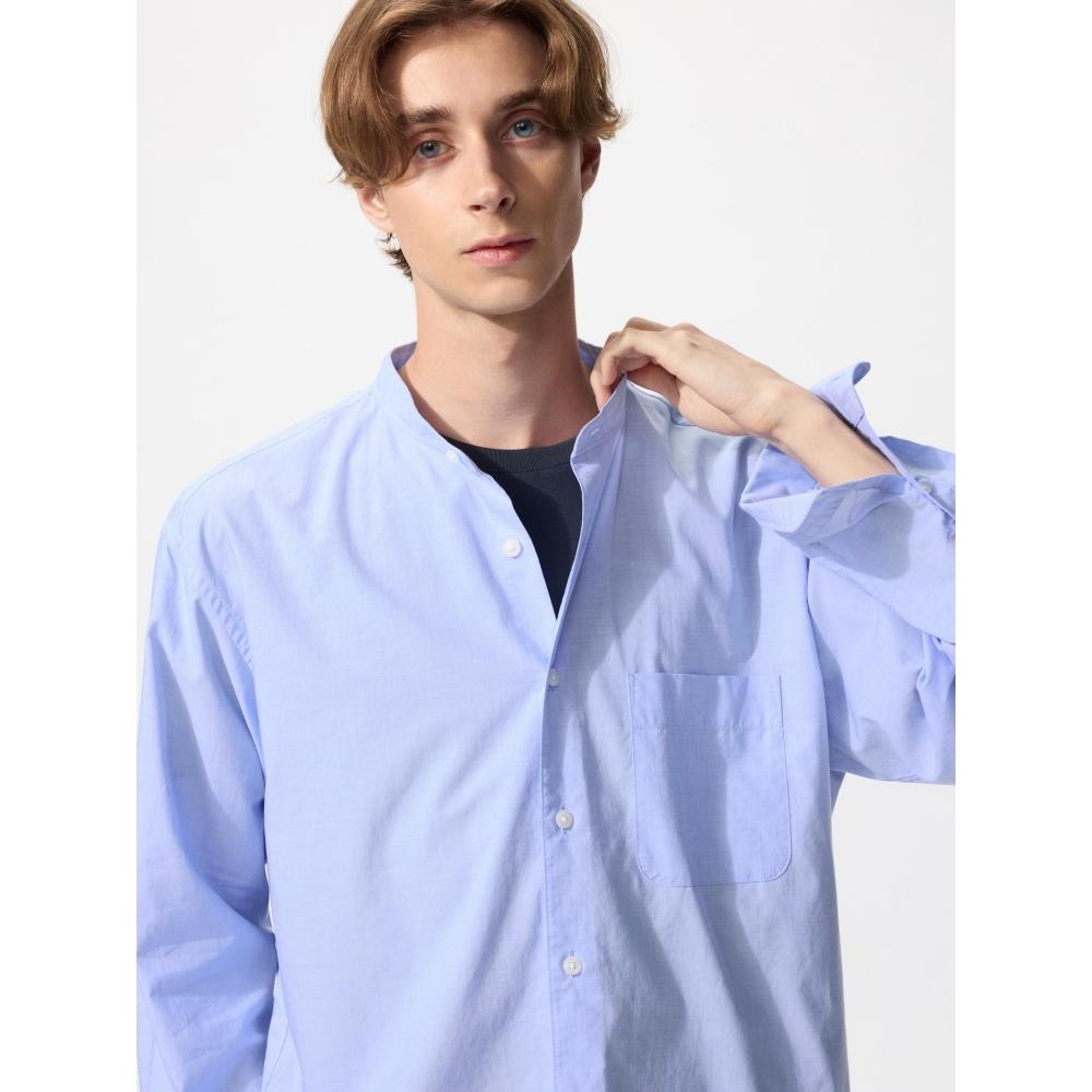 The UNIQLO Japan Broad Stand Collar Shirt is designed with a comfortable relaxed fit, making it versatile for wearing tucked in or over. It features a French front style that delivers a more sophisticated look, and the stand collar provides a clean accent to the casual appearance.