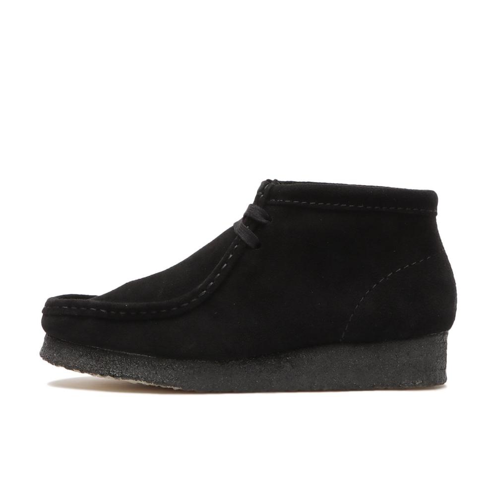 The CLARKS W'S Wallabee Boot (26155521 Black Suede) is crafted from luxurious black suede, emphasizing a feminine charm. This product fuses comfortable wearability with a stylish design, suitable for various styling options.