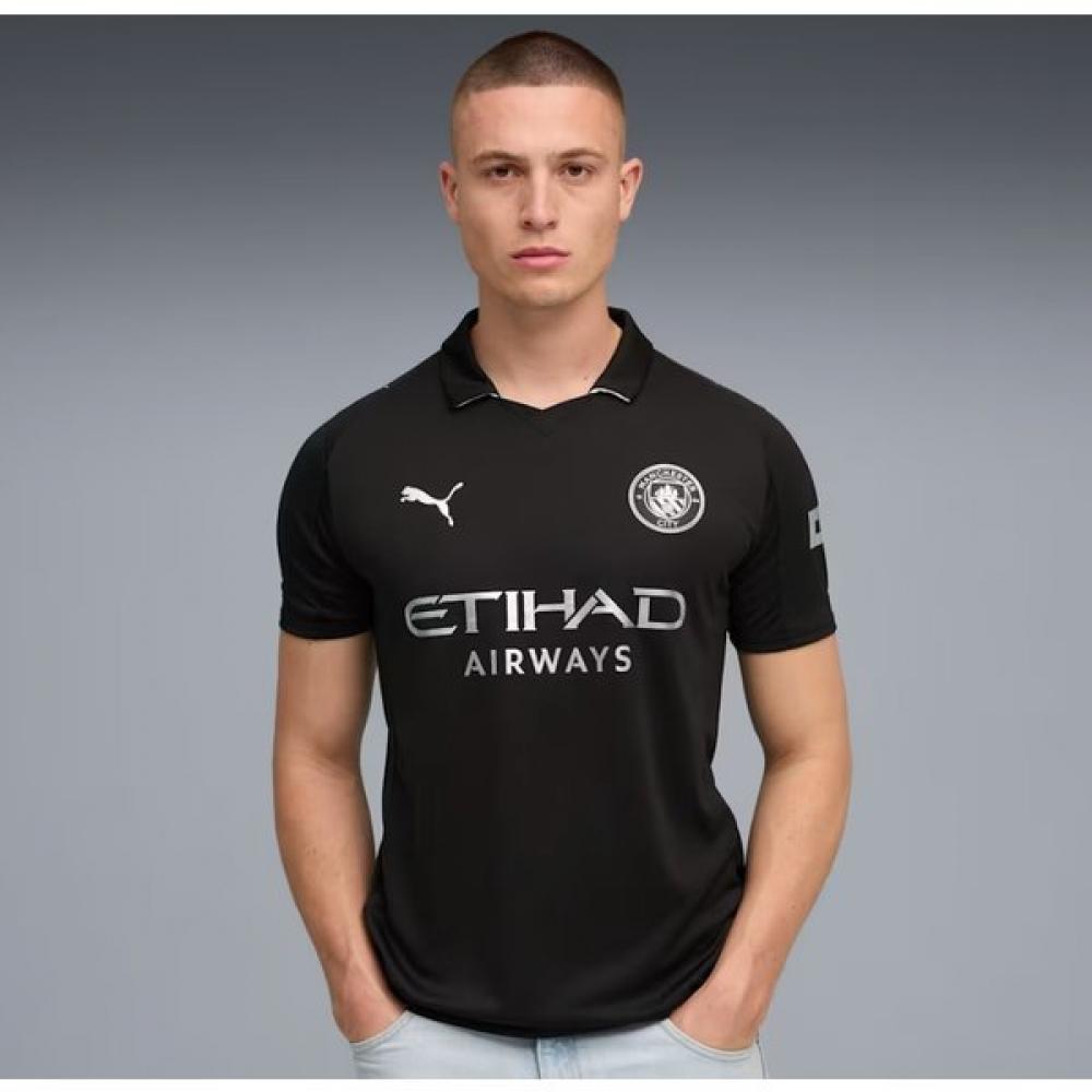 The Puma 780350 02 MCFC Away Jersey Replica is a representation of the Manchester City Away Team uniform for the 2025/26 season. The black color design showcases the essence of blockcore style, embedding the regional code of Manchester. Features include DRYCELL polo neck detail, MCFC official badge, official sponsor logo, shoulder panel, and curved side and arm panels, with more than 95% of recycled materials used through the RE:FIBRE program, making it an environmentally friendly product.