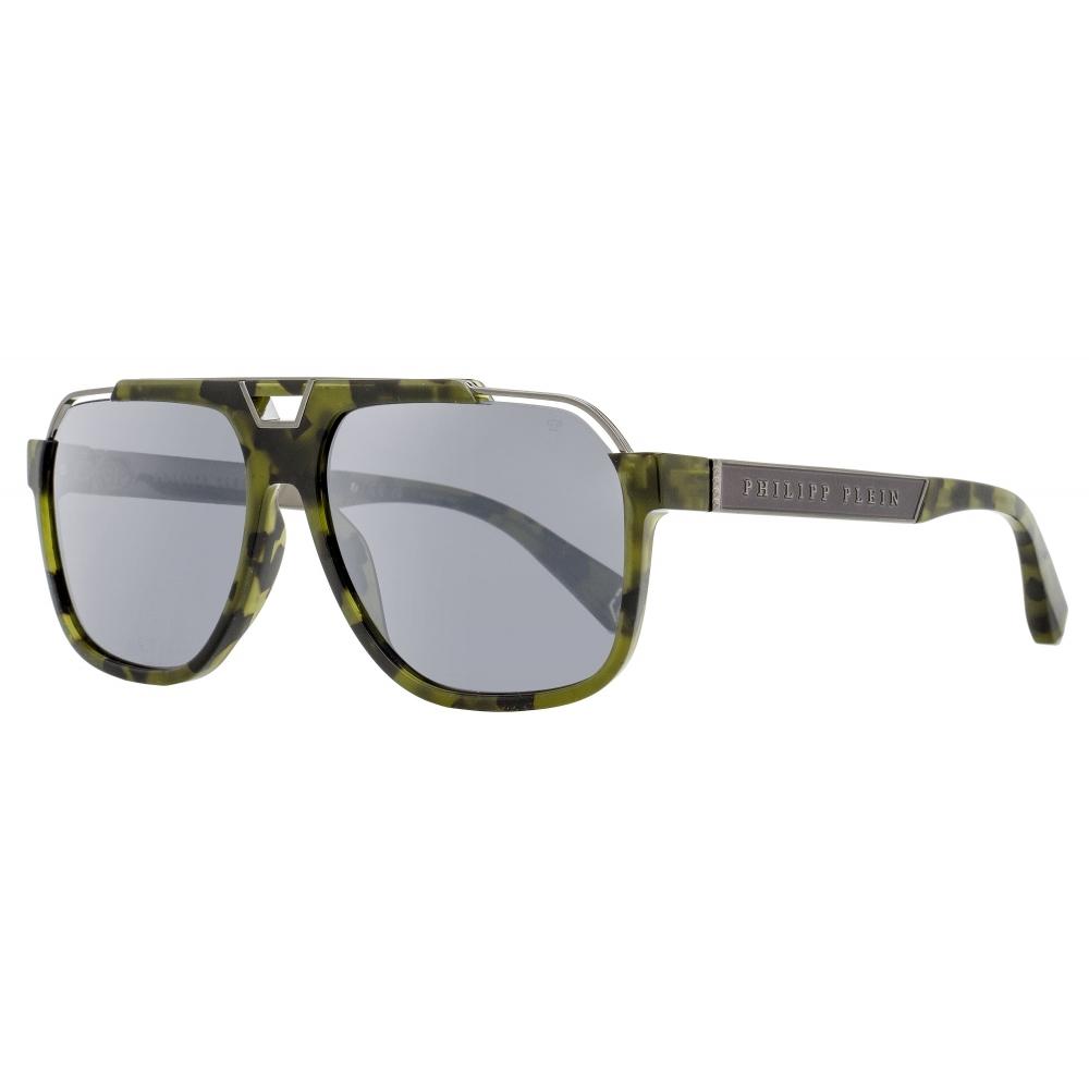 The Philipp Plein SPP046 sunglasses feature a large Navigator shape with a cutout bridge design. The acetate frame is accented with large metal logo plaques on both temples, making these sunglasses functional as well as fashionable. They provide 100% UV protection from harmful rays.