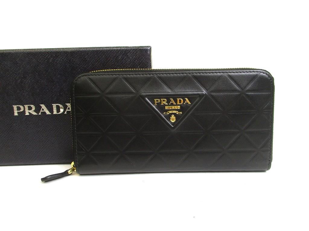Product : PRADA Triangel Black Leather Gold H/W Large Round Zip Long Wallet #b076