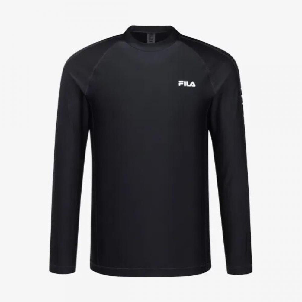 The FILA Pullover Rash Guard FS2RTG2402MBLK is a black rash guard made of highly stretchable tricot material. It features UV protective processing to shield the skin from harmful UV rays and is made from dense fabric that eliminates worries about transparency. Its pullover style allows for easy wearing and it's suitable for water sports like swimming and surfing.