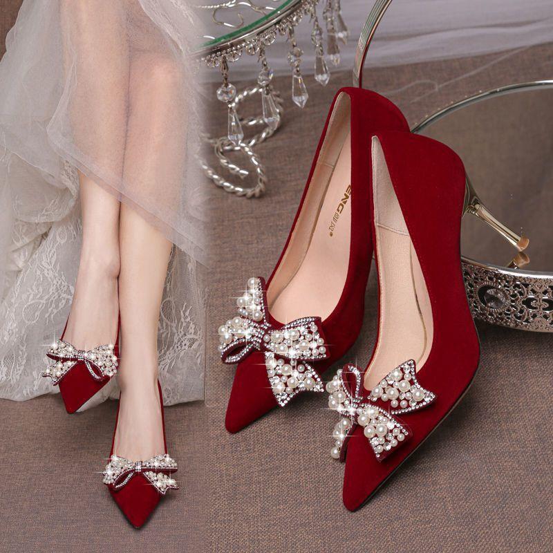Wedding Shoes Women's Bow High Heel Bride Shoes Red Show Clothes Wedding Dress Dual-purpose Wedding Shoes Toasting Not Tired Feet Single Shoes