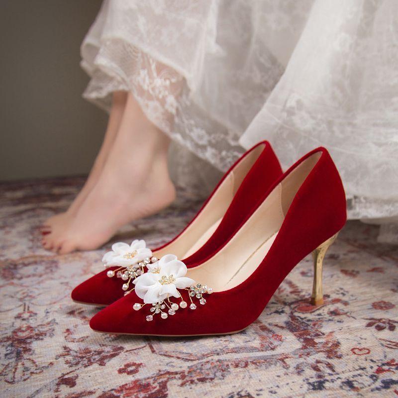 Pointed Stiletto Wedding Shoes Women's Autumn and Winter New Flower Toast Clothes Are Not Tired of Feet Burgundy High Heels