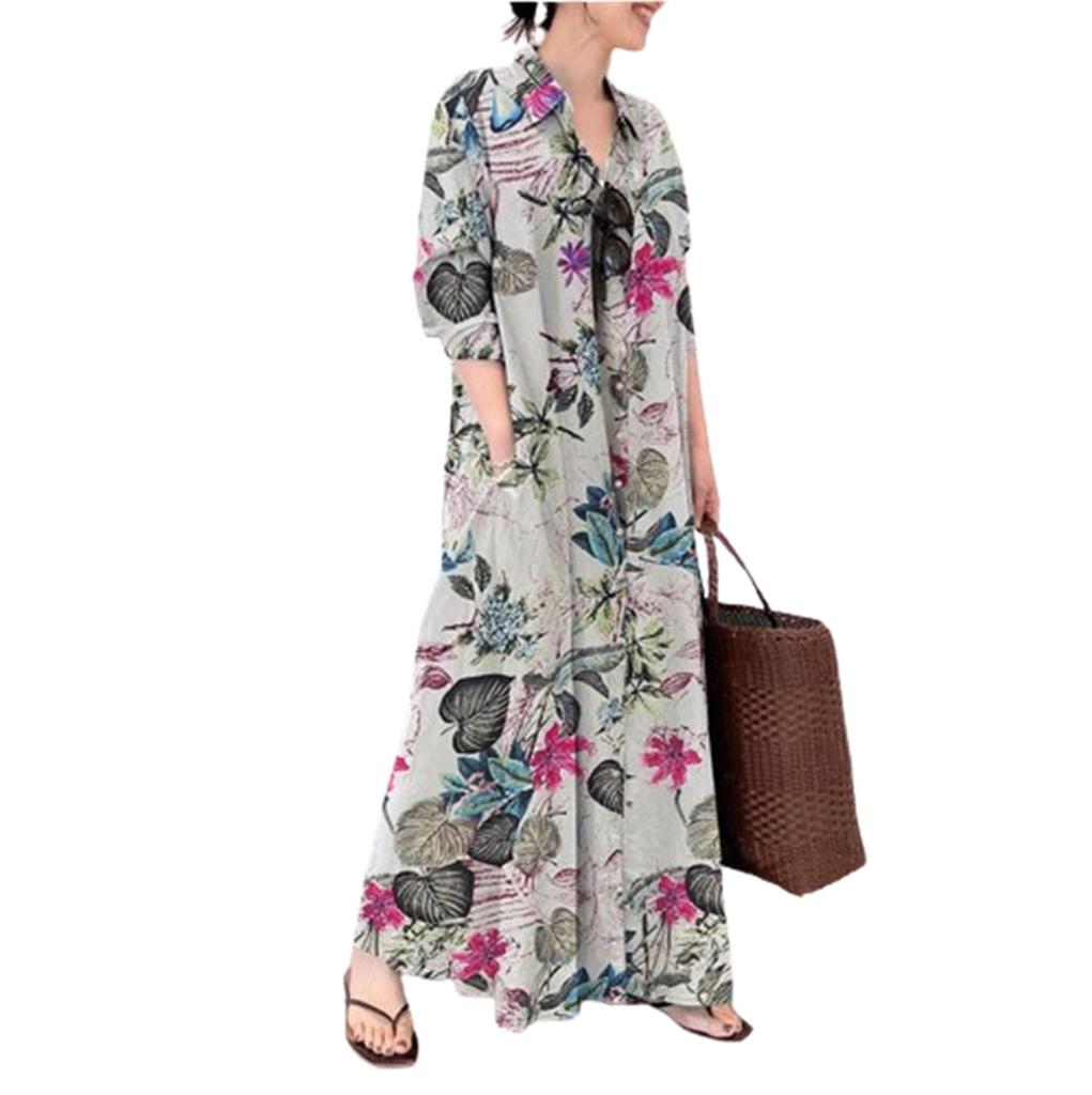 Long Shirt and Long Floral Maxi Resort Plus Sizes Popular Floral Print [kisetsumate] Women's Cotton-Linen Dress, Dress, Spring, Summer, Fall, Sleeve,
