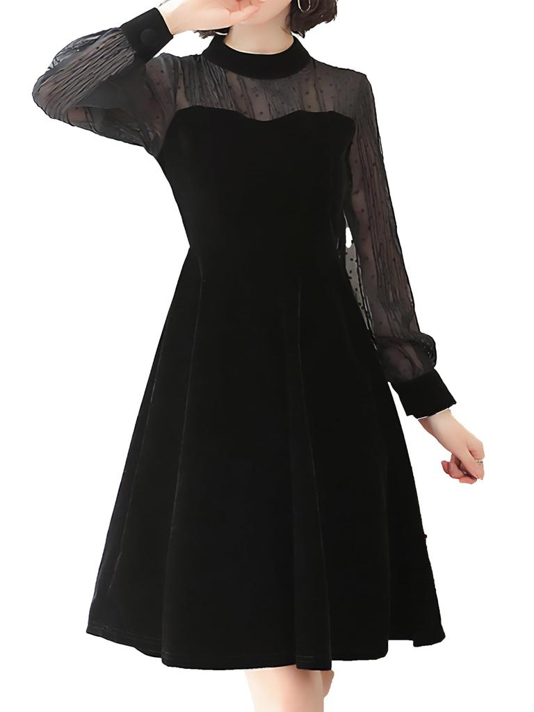 The decollete and sleeves are made of sheer chiffon fabric, giving it an elegant finish. The body is made of stretchy material, making this an A-line casual dress with just the right amount of tightness.