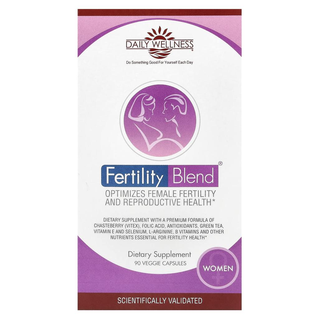 Product Description: Doing Good for Me Every Day Optimizing Women's Fertility and Reproductive Health Supplement Scientifically Verified Chasteberry (Vitex), Folic Acid, Antioxidants, Green Tea, Vitamin E, Selenium, l-Arginine, B Vitamins and Reproductive Health A supplement containing a premium formula made with other essential nutrients that are good for your health. A nutritional supplement blend that has been scientifically proven to contribute to enhanced reproductive health. Chasteberry herb helps with proper hormonal balance and normal ovulation. Antioxidants green tea, vitamin E and selenium enhance reproductive health. The amino acid l-arginine helps maintain a healthy uterine lining. Vitamins B6, B12, folic acid, iron, magnesium and zinc also contribute to maintaining reproductive health. Consuming sufficient amounts of folic acid as part of a healthy diet (before and early in pregnancy) can reduce the risk of birth defects in the fetal neural tube.The Daily Wellness Company is committed to supporting scientific research in its completed formulas. A double-blind, placebo-controlled study conducted in collaboration with Stanford University School of Medicine demonstrated that treatment groups taking Fertility Blend® for Women experienced significantly higher pregnancy rates and enhanced reproductive health benefits compared to the placebo group. Changes in lifestyle often contribute to increasing the chances of becoming pregnant. Smoking, caffeine, alcohol consumption, being over or underweight, and stress have been linked to decreased fertility in women. Reproductive organs are highly vulnerable to free radical or oxidative damage caused by environmental toxins and aging. A balanced diet and nutritional supplements rich in antioxidants can help minimize this damage.