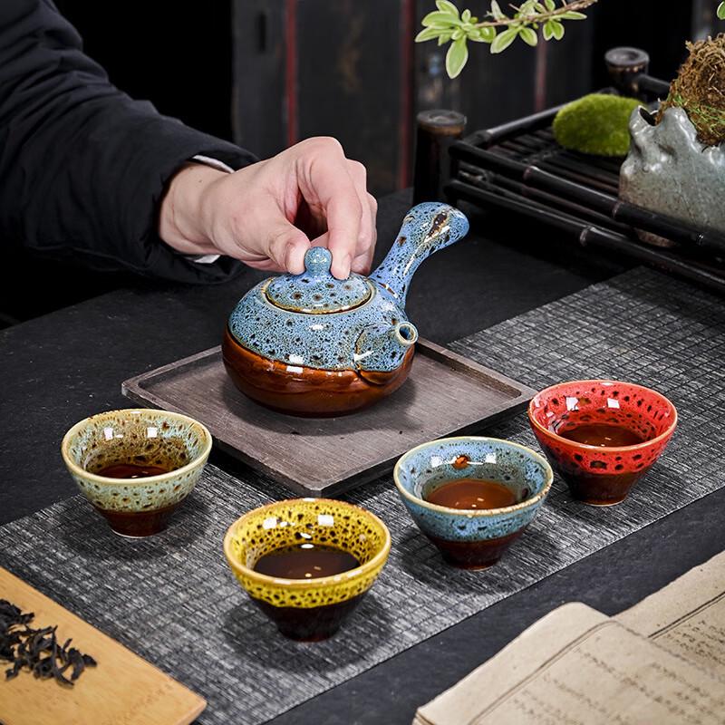 Nufeng Kiln-Glazed Kung Fu Tea Set with Side Handle Pot & Four Color Cups