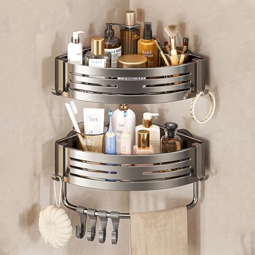 Vinnatsu Bathroom Corner Rack with Strong Suction Cups, Bathroom Rack with 8 Hooks, Aluminum Alloy, Strong Adhesive Mounting, Bath Storage, Shower Rac