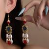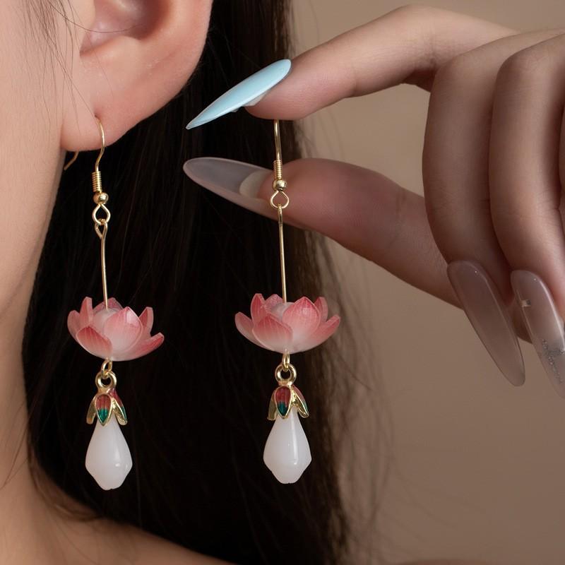 Antique New Chinese Long Earrings Imitation Pearl Water Drop Lotus Earrings Women'S National Tide Elegant Retro New Chinese Earrings