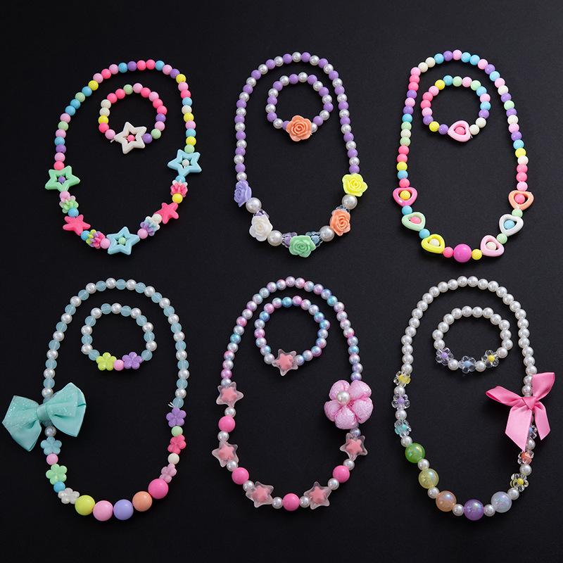Boys And Girls Baby Princess Candy Color Beaded Necklace Bracelet Set Flower Pearl Bow Dress Accessories