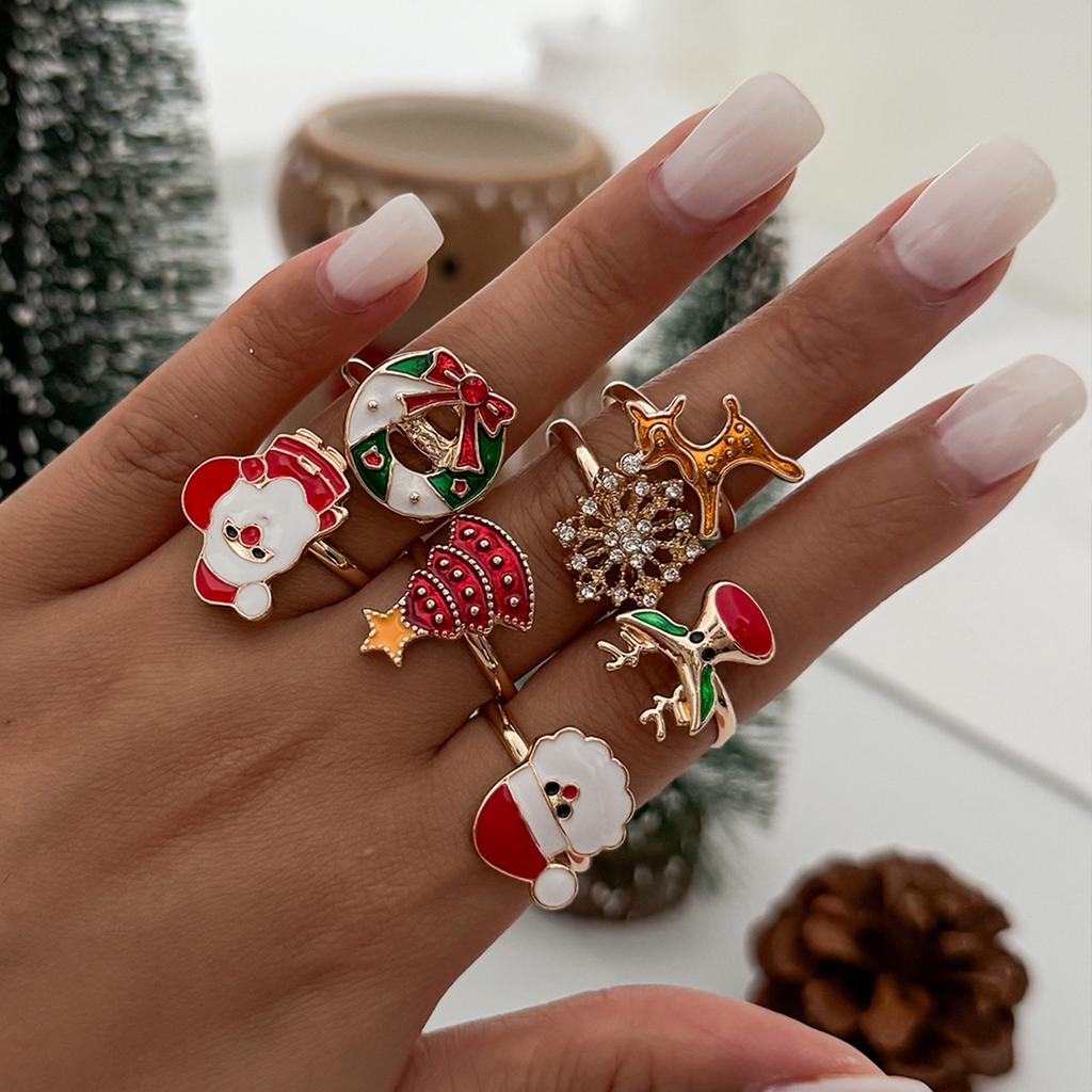 Cartoon Drip Santa Elk Ring, Creative Christmas Tree With Diamond Snowflake Opening Ring