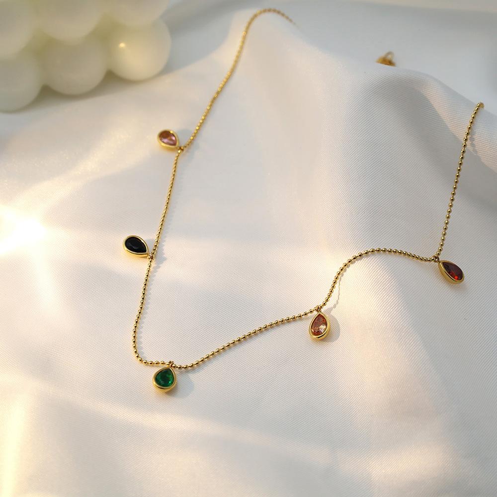 Bohemian Style Multi-Color Contrasting Color Color Water Drop Shape Zircon Collarbone Chain Necklace Women'S Fashion Titanium Steel Jewelry