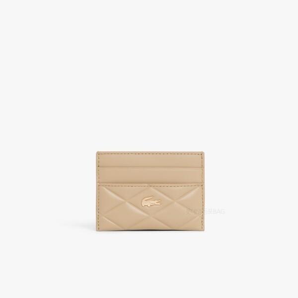 - Detailed Description: The Lacoste 26SS Crocodile Card Wallet is a luxurious product with a quilted design point, part of the new line for the 2026 SS season. It is made of genuine leather or luxurious cowhide, emphasizing a high-end mood. The brand's mini gold crocodile logo is decorated on the front, highlighting the gold crocodile detail. The internal layout features 2 card slots and 1 multi pocket for practical use. Color options include basic black, as well as seasonal colors like beige, pink, burgundy, yellow, and taupe & pink, totaling more than 5 colors. The size is compact, measuring approximately 10.5cm in width, 8cm in height, and 1cm in thickness. The product falls under the category of women's card wallets and is classified in the brand goods category of wallets/belts > card holders/key holders. This product belongs to the cowhide goods line and features a crocodile design reminiscent of crocodile leather textures with a luxurious finish.
