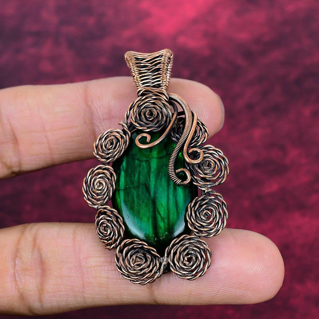Green Fire Labradorite Pendant Flower Jewelry Copper Wire Wrap Gemstone Pendant