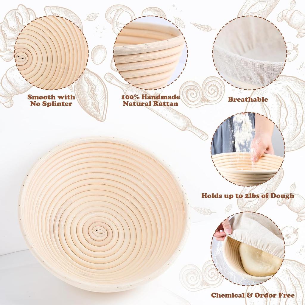 Bread Proofing Basket Set Sourdough Bread Making Supplies Baking Fermentation Basket Rattan Basket Gift Set (9 Inch, Round)