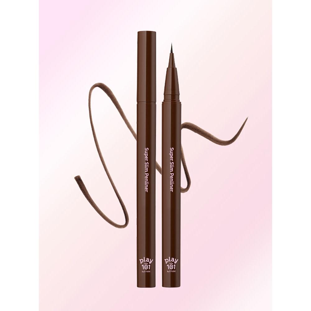 PLAY 101 by ETUDE Super Slim Proof Pen Liner [02 Brown] is a 1.5mm ultrafine pencil liner that delicately fills in the eyelash line and mucous membrane, achieving a natural and defined eye look. With a texture reminiscent of real gel liner, it smoothly glides and provides strong fixation. The ultra-slim brush allows for easy application of thin yet sharp eyeliner. The emulsion film polymer keeps the makeup radiant throughout the day.