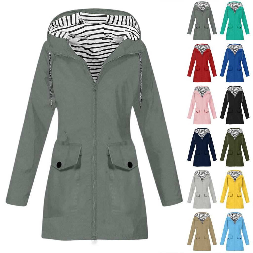 Women Stripe Rain Jacket Outdoor Plus Hooded Raincoat Windproof