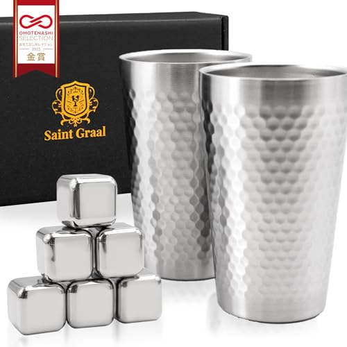 Product Details: Two stainless steel tumblers (approx. 350ml) and six ice cubes (2.5x2.5x2.5cm). SaintGraal can accommodate any quantity, from retirement gifts, anniversaries, and bridal gifts to event giveaways. We offer support for everything from small-lot prototypes to bulk orders, including personalization, engraving, layout suggestions, and individual packaging. Feel free to discuss delivery dates and budgets. SaintGraal offers high-quality, elegant kitchenware based on the concept of "a higher-class lifestyle." [Target age] 13 years and older. Not suitable for infants and young children (generally 0-6 years old) due to the risk of swallowing or choking. Always use under adult supervision. [Storage] After use, store out of reach of children.