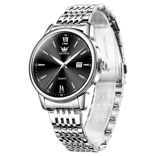 OLEVS Men's Stylish and Popular Black Quartz Analog Watch for Business and Work, Waterproof, Silver Stainless Steel Band, Black Dial, Date Display, Si