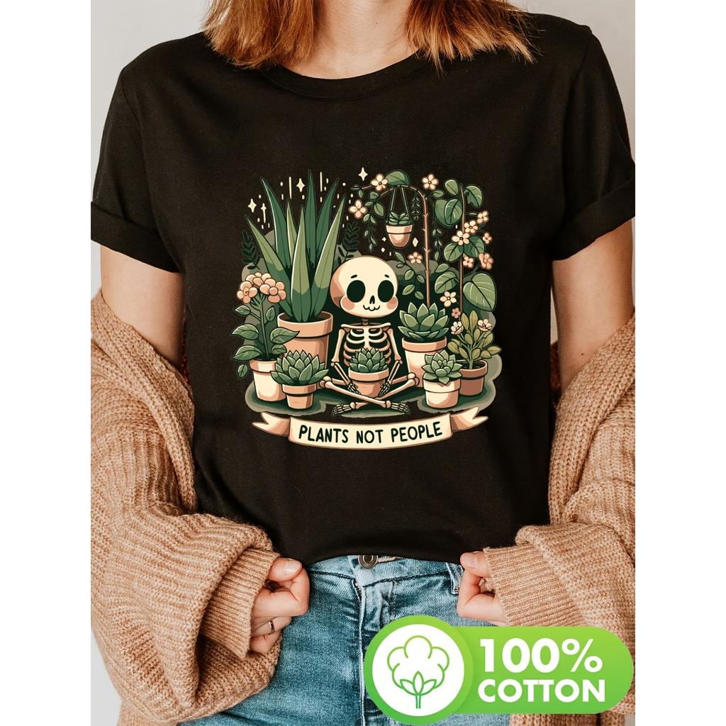 Y-Plant Enthusiast Skeleton Frame Print T-Shirt, Short-Sleeved Crew Neck Casual Top for Summer and Spring, Women'S Apparel
