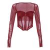 Women's Black Mesh Long Sleeve Corset Top, Square Neck Sheer Boned Crop Top for Streetwear & Party