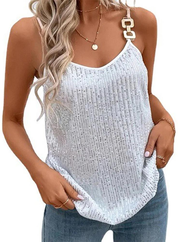 Women Glitter Loose Camisole Tops Sleeveless V Neck Vest Casual Elegant Tank Tops Female Summer Shirts