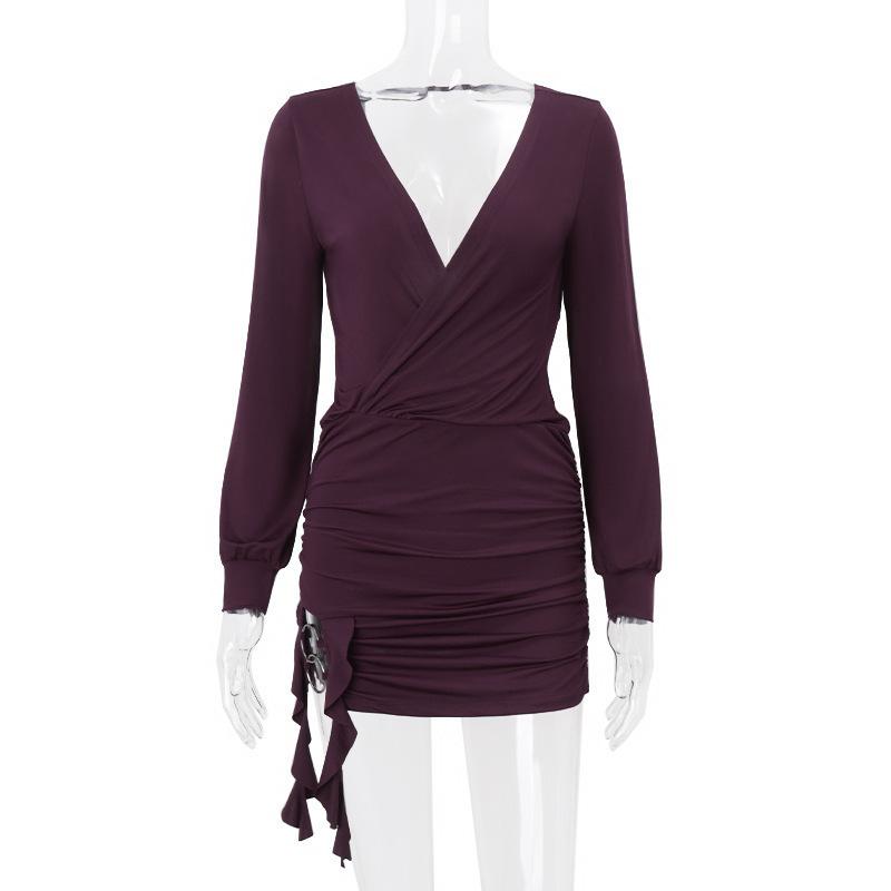 Spring Sexy Deep V-neck Solid Color Long Sleeved Hip Hugging Dress for Women