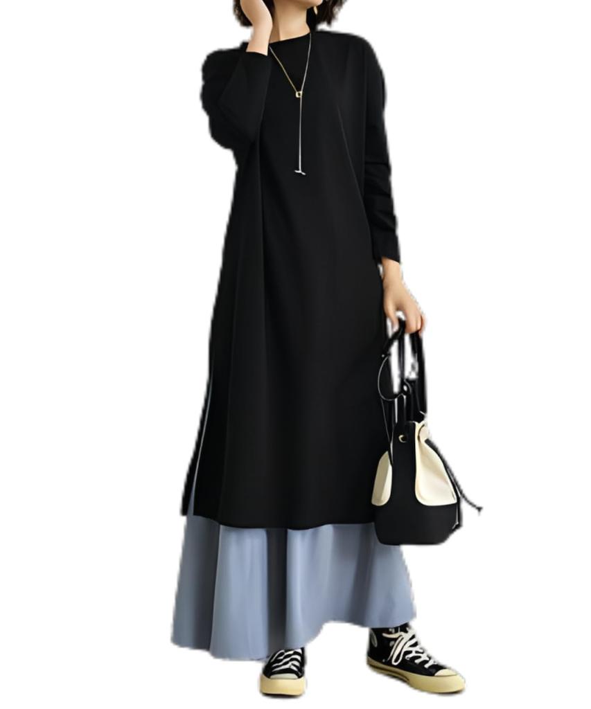 [Colors] Off-white, coffee, blue, purple [Size] One size fits all (total length approximately 120cm) *The "coffee" color is a slightly lighter shade of brown, similar to the top image. Actual appearance may vary depending on the lighting and viewing environment, so please check before purchasing. ★ [Cute and Relaxed Dress for Adults] Made with a sophisticated, flowing fabric, this dress is breathable and wrinkle-resistant for a smooth feel against the skin. The soft cotton blend fabric provides a light feel and excellent figure-flattering effect. The maxi-length design with a relaxed silhouette that covers the buttocks is recommended for a wide range of ages, from those in their 20s to those in their 50s. The lightweight, sheer fabric makes it perfect for spring and fall, and in winter, layer it with tights, innerwear, or a knit cardigan for a comfortable look. ★ [Easy and Stylish Layered Design] The docking design creates the illusion of a dress and skirt. This versatile two-piece long hoodie and skirt set can be worn casually or femininely. The side slits allow for easy movement, and the flowing hem adds a touch of femininity with every step. Naturally covers your body shape while relaxing