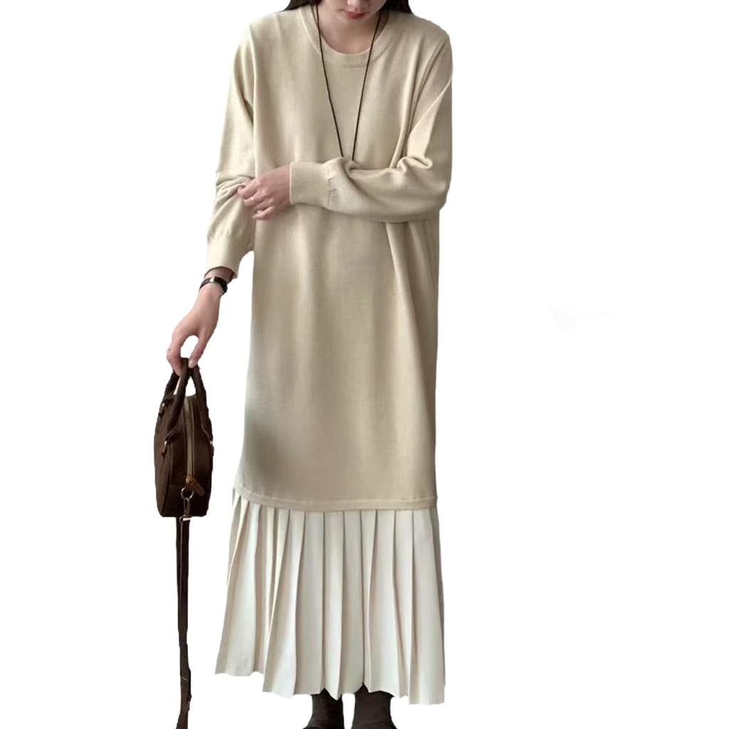 H2four Knit Long Round Long Solid Perfect for Office Winter Women's Dress, Neck, Sleeves, Pleated, Warm, Figure-Flattering, Slimming, Casual, Simple,