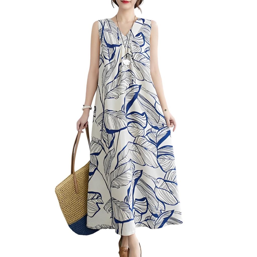 Introducing a retro-designed 2-way sleeveless dress! This elegant, vibrant sleeveless long dress is stylish on its own, and its flowing flow creates a feminine silhouette with every movement. The eye-catching, oversized print makes this an elegant summer dress for adults. It offers a comfortable, stress-free fit that's perfect for everyday wear. The flowing skirt adds a touch of elegance, and the relaxed silhouette flatters the body, making it easy to wear even for plus-size and pregnant women. The wide bust and slightly loose silhouette create a relaxed feel. Perfect for everyday style, the draped hem, which sways like a refreshing breeze, creates a cool and elegant impression. Available in both square and V-neck styles, the wide seam accentuates the delicate upper arms and décolleté. This beautiful A-line flared dress features ample gathers flowing from the décolleté seam. The large motif and the fabric with a drape create a simple yet stylish look, and the maxi dress is sure to be a hit this summer.