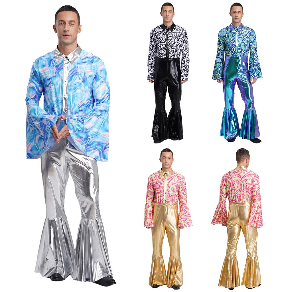 Mens Metallic Bell Bottom Disco Jumpsuit Turn Down Collar Flared Sleeves Printed Bodice Bodysuit Party Costume