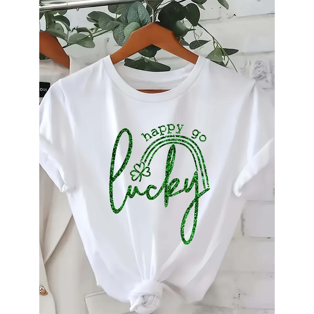 Patrick'S Day "Lucky" Alphabet Print Crew Neck T-Shirt, Casual Polyester Knit Fabric Tee