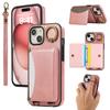 For iPhone 15 PU Leather Back Case Card Holder Kickstand Phone Cover with Wrist Strap