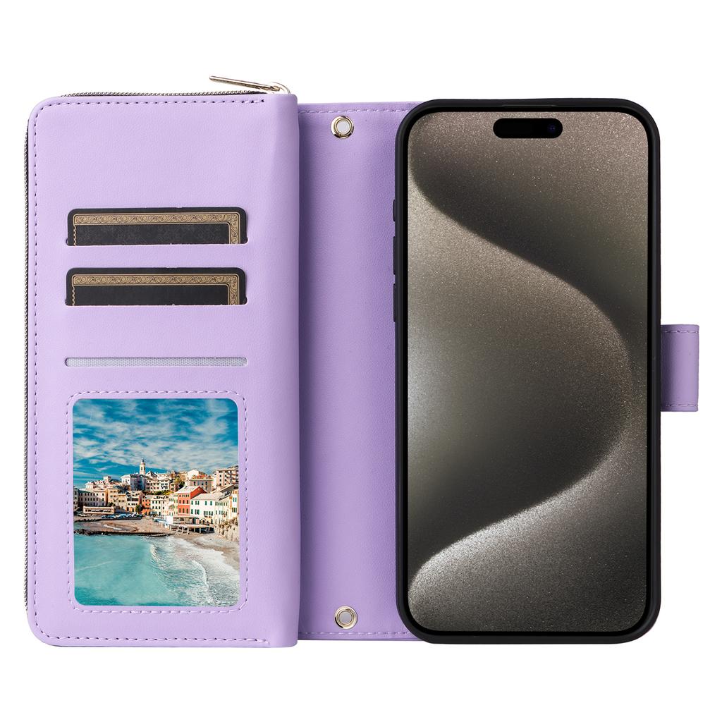 R20 For iPhone 15 Pro Case Zipper Pocket PU Leather Cover with 9 Card Slots