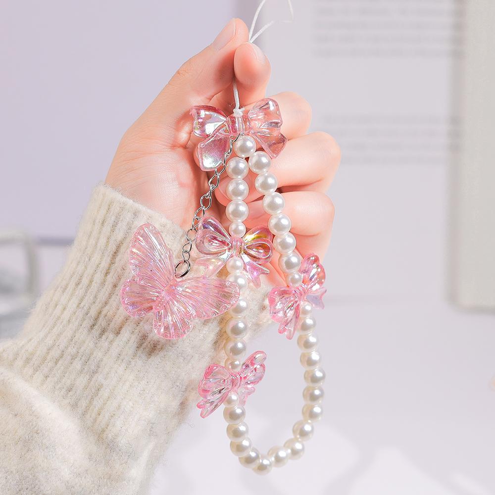 Pink Butterfly Pearl Bow Phone Chain Anti-Lost Bracelet For Mobile Phone Case Wrist Strap Lanyard Phone Keychain Portable Chain