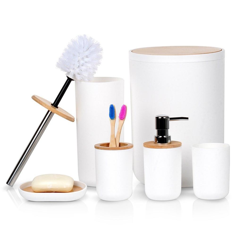 BATHROOM SET: MUG, TOILET BRUSH, WASTE BIN, SOAP DISPENSER, STAND 6-Piece Bathroom Accessory Set- Bathroom accessory set consisting of: soap dispenser, soap dish, cup for utensils such as toothbrush or toothpaste, additional cup, toilet brush with container, and waste bin with hinged lid. Durable and Durable- The set is made of the highest quality white plastic, and the accessories are made of bamboo wood. The combination of white and wood adds elegance and warmth to any bathroom.