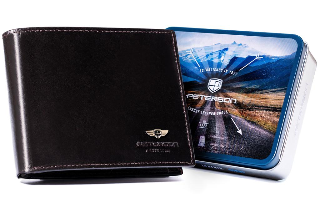Peterson classic men's wallet, natural leather, for RFID cards PETERSON men's leather wallet for RFID cards #⃣ Reputable Polish brand | Product of a well-known and respected Polish brand with a long tradition #⃣ Model for men of all ages| Very durable, made of high-quality, smooth natural leather in a dark brown color. Choose a wallet that will last you for years! #⃣ Classic style | Elegant wallet with a classic style. Landscape style, no external clasp.#⃣Plenty of space for cards and documents.| It will hold all your most essential documents and cards, and thanks to its medium size, it won't overcrowd your pockets. This model holds your vehicle registration certificate.#⃣Highest level of security.| Equipped with RFID BLOCKING SYSTEM technology, which protects proximity cards, biometric documents, ID cards, and public transport cards against unauthorized data reading.IDEAL FOR A GIFTBy purchasing this wallet, you get an elegantly packaged, complete gift, ready to give to a loved one.With the wallet, you always receive: an elegant metal box (a beautiful decorative branded tin visible at the auction) a set of branded tags Package dimensions: 12x14.5x4 cm. Wallet from the latest collectionThe inside of the wallet has been designed so that you can fit all the cards, documents and money you need on a daily basis. Additionally, the interior is lined with a lining that will protect the leather from damage.Inside you will find: 4 compartments for large documents, including 1 in the form of a window, the model will successfully fit a registration certificate; 1 compartment for payment cards, business cards and standard-sized documents, including 1 in the form of a window 1 zipper compartment in the central part of the wallet Each wallet is packed in an elegant branded box. With us you save time on wrapping gifts! Perfect for traditionalistsYou can fit a considerable amount of cash in the pockets for coins and banknotes.You can put coins in 1⃣ pocket fastened with a snap; You can store your banknotes in 2⃣ wide, open pockets Parameters Manufacturer: PETERSON® Material: natural leather Height: 10 cm Width: 12 cm Depth: 3 cm Number of coin slots: 1 Number of banknote slots: 2 Number of card slots: 11 Number of slots for larger documents: 4 Orientation: horizontal External fastening: none Holds a registration certificate: yes The security of your cards is our top priority! Wallet equipped with a special lining with RFID BLOCKING SYSTEM (Radio-Frequency IDentification), which protects contactless cards, biometric documents, ID cards and public transport cards against unauthorized data reading. The technology prevents data from being read using special readers used for data theft.RFID anti-theft protection for the following documents: Biometric passports All contactless payment cards such as Paypass, Paywave, Wave and Blink New student ID cards Public transport cards Building access cards operating on a 13.56 MHz frequency MIFARE, HID iClass, DESFire cards Peterson® - choose a renowned brand! Peterson® accessories are extremely popular. Each product is designed in line with current trends, reflecting an original and timeless style. A wealth of colors and patterns, as well as high-quality workmanship, are the hallmarks of the brand. Feel fashionable and comfortable in every situation, complement your wardrobe with fantastic accessories at very affordable prices!