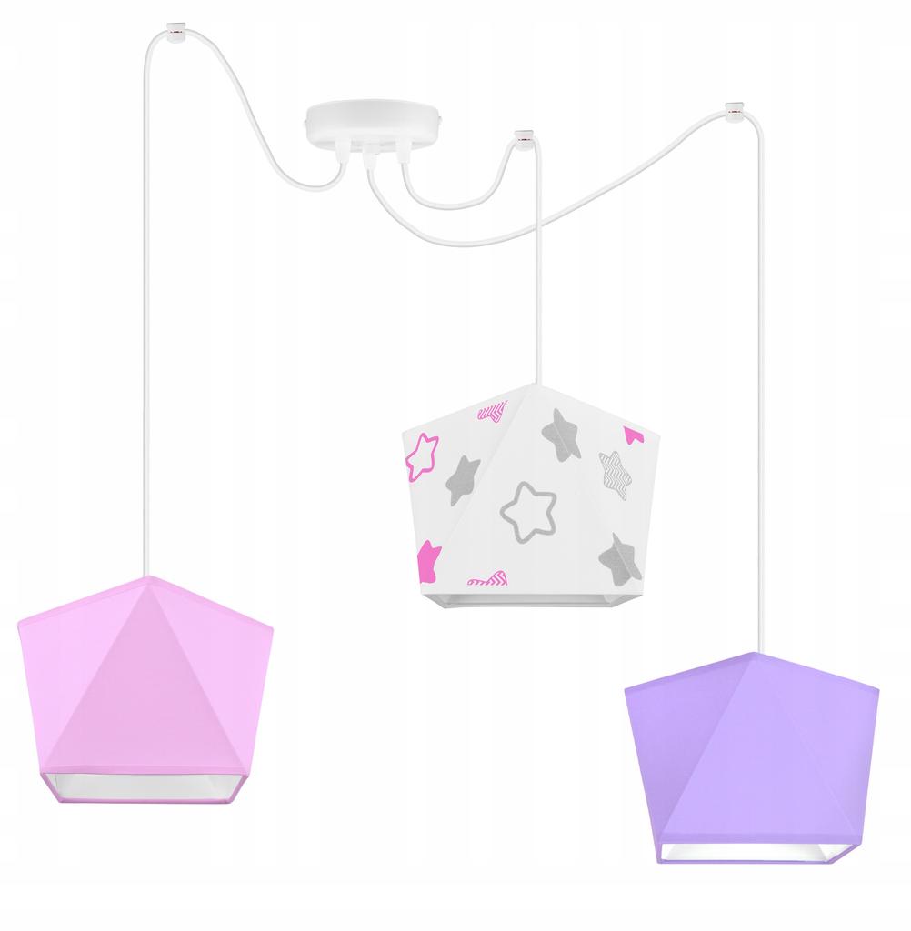 CEILING HANGING LAMP CHILDREN'S LAMP SHADE CHILDREN'S CHANDELIER LED SPIDER LAMP DIUNA 2255/3/Dmanufacturer: Light-Homeframe color: whitelampshade colors: white, light gray, blue, red, pink, purplelampshade patterns: ballerinas, blue flamingos, green flamingos, green stars, pink stars, pandas, rabbits, patternsconstruction material: metallampshade construction: fabric, PVC, metal framepower supply: ~230 [V], no transformer requiredlight source: E27 bulb (not included)height adjustment: yeslampshade height: 15 cmtotal height: max. 200 cmMounting: wall plugs (not included)Product code: SPIDER DIUNA 2255/3/DThe lamp comes with an instruction manual and assembly instructions!Other models from the SPIDER DIUNA series are available on our auctions Time to change your apartment decor! Our unique children's hanging lamp will transform your arrangement, giving it a unique character. Stylish design, solid construction, and the perfect color combination beautifully decorate interiors. The lamp's unique appearance suits any type of room. The lighting has space for three light sources. SPIDER DIUNA LampA stunning lamp that will add a unique character to your interior. The lighting will beautifully complement a children's room. The lighting can be adjusted in height up to 200 cm. The lamp is powered by the most popular type of E27 light bulbs with a maximum power of 60W.You can buy the appropriate bulbs in a set with the lampLamp features:Easy and quick assembly that won't cause you any difficultiesNew, Polish productSolid construction!Unique, original lampshade shape!Lampshade height adjustmentDesigner and modern lamp style! It will certainly add a lot of style to your interior.Possibility of turning on the lamp 2/1 or 3 times.The set includes:Complete lamp ready for installation.Instruction manual.Connection block.Purchase document.Lamp dimensions:Height of the ceiling 12 cm.Total width 22.5 cm.Height (adjustable) up to 200 cm.Lampshade width 22.5 cm.Lampshade height 15 cm.Fully assembled lamp - you don't have to assemble it yourself. Available colors:Lampshade patterns:pink stars, green stars, blue flamingos, green flamingos, pandas, rabbits, ballerina, patternsLampshade colors: white, light gray, red, pink, blue, purpleConstruction colors: whitePlease provide information about the selected lamp color in the message to the seller.If such information is not provided, the lamp visible in the main photo will be sent. Attention to detail: Assembly instructions: