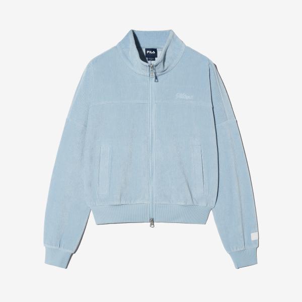 The FILA Velour Track Top is a women's track top made from soft yet firm ribbed velour material. Its semi-crop length design pairs well with bottoms and makes it suitable for both sporty and fashionable looks. This product can be worn from the transitional season to early winter and is useful for both active activities and daily wear. It is available in the color LBU (Light Blue).