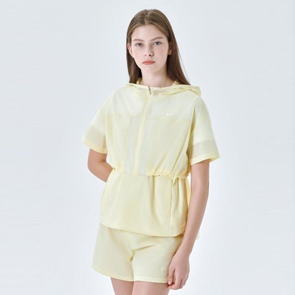 The FILA Lightweight Stretch Short Sleeve Anorak is made from lightweight stretch material and is suitable for outdoor and sports leisure activities, categorized as a women's hiking t-shirt. This product features a hood and short sleeves to act as a windbreaker and has an internal waist string to adjust the fit. There are various color options to choose from according to your preference.