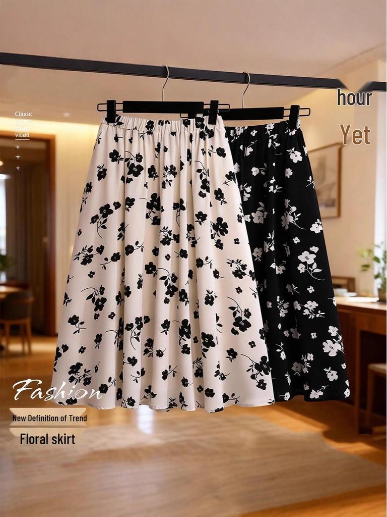 Women's Black Floral A-Line Midi Skirt: Versatile Spring/Autumn Fashion Trend.