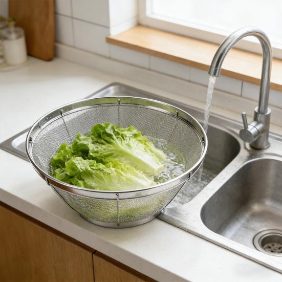 Secure Strainer Basket Construction: Crafted with a sturdy wide-sided frame and reinforced support base, this round mesh strainer sits securely on pots, sinks, or countertops. Its stable design frees your hands during cooking tasks, providing convenience and safety while you multitask in the kitchen.