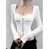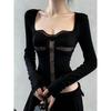 Autumn Winter Retro Black Square Neck Lace Patchwork Long Sleeve Women's Top