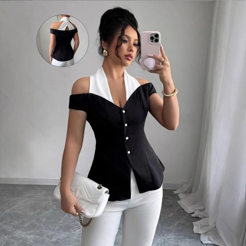 This stylish women's off-the-shoulder shirt combines European and American fashion aesthetics. Crafted from a Tencel blended fabric, it offers a luxurious feel, while the acrylic material provides durability and comfort. The halter neckline adds a touch of elegance, making it an ideal choice for both casual and office wear. The slim fit design flatters the silhouette, creating a chic and sophisticated look for any occasion. The black and white color scheme further enhances its versatility, ensuring it can be effortlessly paired with a variety of outfits.
