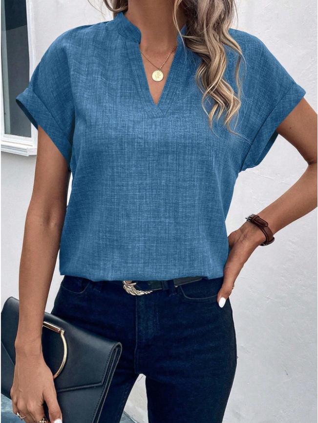 Elevate your summer wardrobe with this stylish and comfortable top. Crafted from high-quality cotton, the shirt features a solid pattern and V-neckline, offering a versatile and chic look. The batwing sleeves provide a relaxed fit, making it perfect for warm-weather outings. Ideal for pairing with jeans or skirts, this short-sleeved shirt is a must-have for any fashion-forward woman's collection.