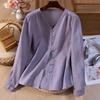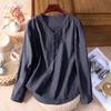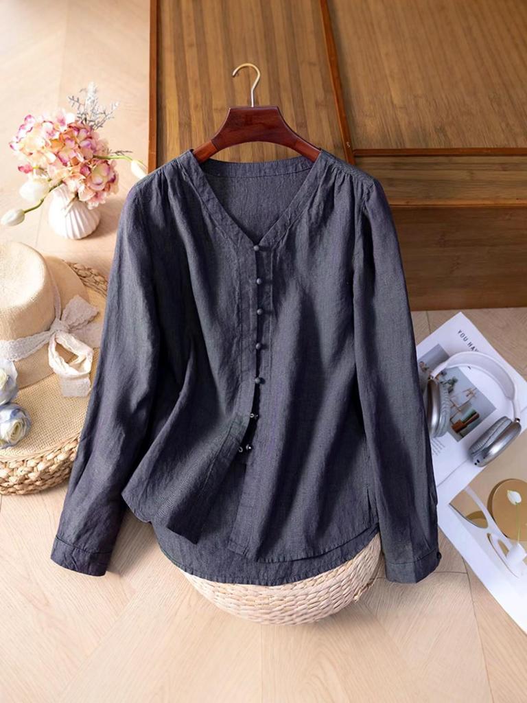 2026 Spring Women's Long Sleeve V-Neck Hemp Shirt - Artistic, Solid Color, Casual & Versatile.