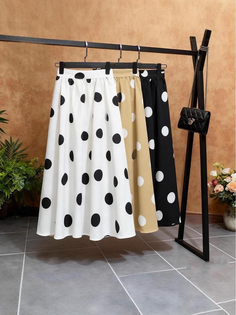 High-Waist French Polka Dot A-Line Midi Skirt with Drape for Women