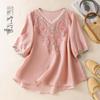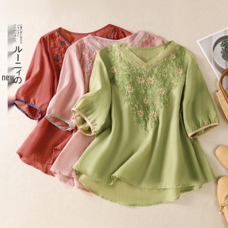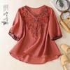2025 Women's Summer Cotton Linen Embroidered V-Neck Loose Retro Pullover Shirt